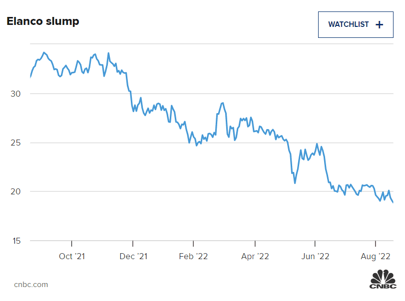 Akcie společnosti Elanco se v letošním roce potýkaly s problémy a za tu dobu klesly o více než 33 %. Za poslední rok se akcie rovněž propadly o 40 %.