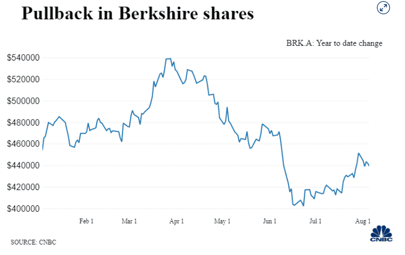 Akcie konglomerátu třídy A se ve druhém čtvrtletí propadly o více než 22 % a z historického maxima dosaženého 28. března jsou nyní téměř o 20 % níže. Zpětný odkup akcií obvykle závisí na tom, zda se akcie podle Buffetta obchodují s dostatečně velkou slevou vůči jejich vnitřní hodnotě a na jiném využití hotovosti.