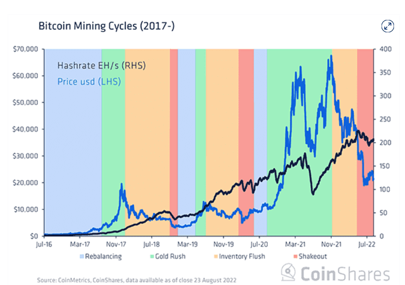 Blízko dna? Společnost CoinShares sestavila graf, který ukazuje korelaci mezi hash rate a cenou bitcoinu. A je rozdělen na oblasti, kde dochází ke „zlaté horečce“, když cena bitcoinu roste, a následnému vyplavení zásob a otřesu těžařů, když cena klesá.