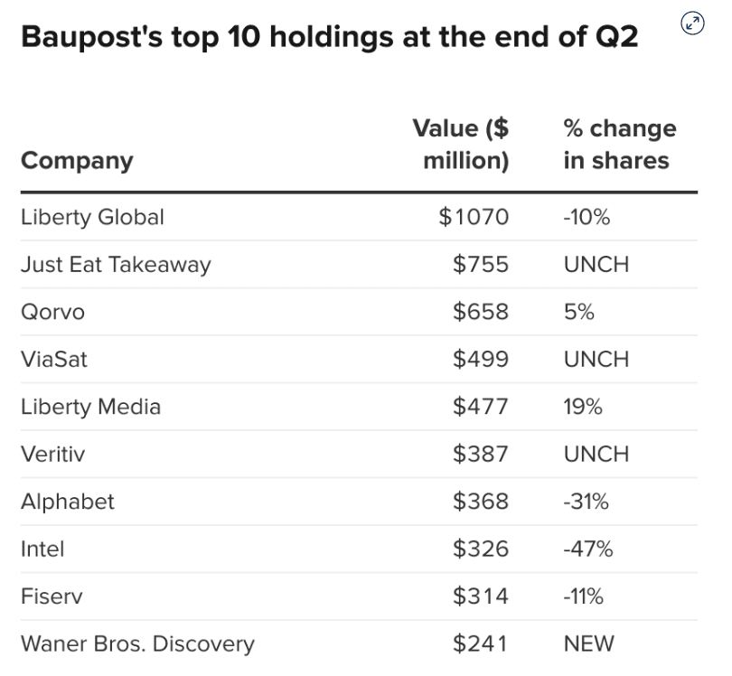 Na konci června si Baupost ponechal některé ze svých dlouhodobých podílů, jako jsou Liberty Global, Just Eat Takeaway, Qorvo a ViaSat. Zatímco budoval podíl ve společnosti Amazon, hedgeový fond snížil své sázky na další technologická jména včetně společností Alphabet a Intel.