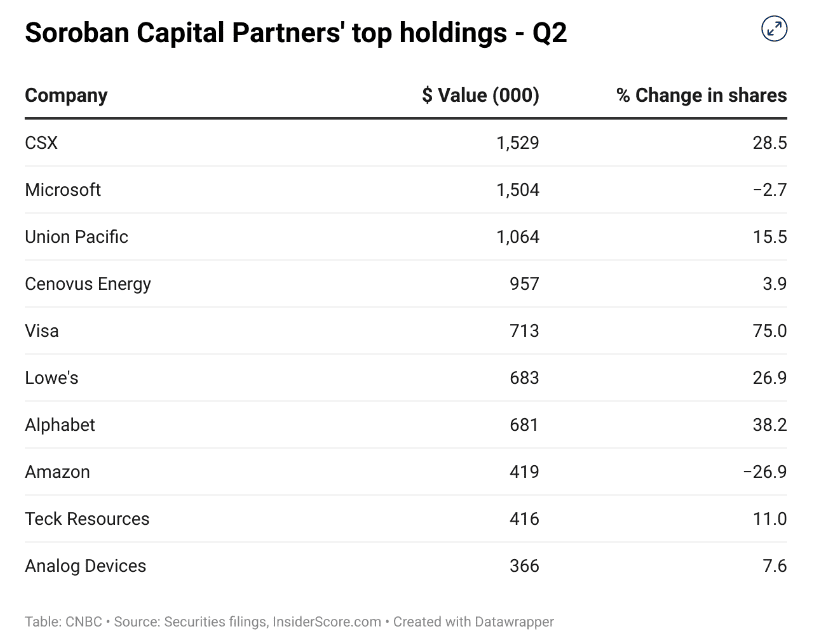 Společnost Soroban Capital Partners, která podle údajů společnosti FactSet patří mezi 25 největších hedgeových fondů podle pozice v akciích, ve druhém čtvrtletí výrazně zvýšila svůj podíl ve společnostech CSX i Union Pacific. Kombinovaná pozice v těchto akciích činila na konci června téměř 2,6 miliardy dolarů.