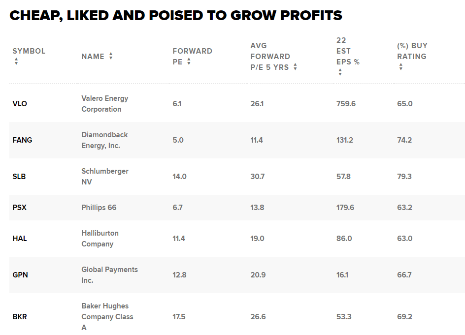 Do seznamu se dostaly i energetické společnosti jako Valero, Diamondback a Halliburton. Valero má nejvyšší míru zisku na akcii v roce 2022 ve výši 759,6 % a může se pochlubit diskontem ceny vůči zisku ve výši téměř 77 %. Energetické společnosti byly v letošním roce nejvýkonnějšími v indexu S&P 500, k čemuž přispěly rostoucí ceny komodit. Přestože ropa ustoupila z nedávných maxim, tyto společnosti se zavázaly držet krok s poptávkou.