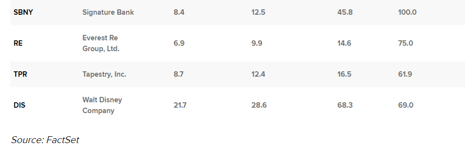 Naše hledání přineslo koncentrovaný seznam složený z několika energetických společností a také mediálního giganta Disney a Signature Bank. Společnost Disney ve středu večer oznámila lepší než očekávané čtvrtletní výsledky, díky čemuž akcie ve čtvrtek vzrostly o více než 5 %.