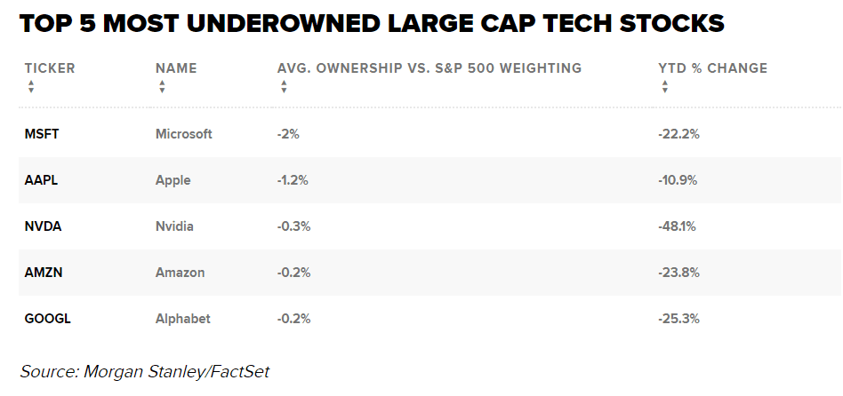 Zdá se, že vyhodnocení nedávných údajů 13F od Morgan Stanley tento trend podporuje, neboť ukazuje, že aktivní manažeři vlastní méně velkých technologických akcií ve srovnání s jejich váhami v indexu S&P 500. Podle banky by to však mohlo být do budoucna pozitivní.