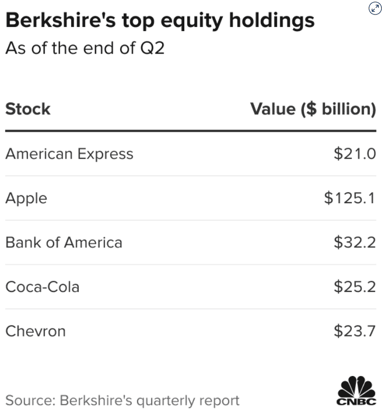 Společnost Apple byla na konci druhého čtvrtletí stále největší investicí Berkshire do běžných akcií s tržní hodnotou 125,1 miliardy dolarů.