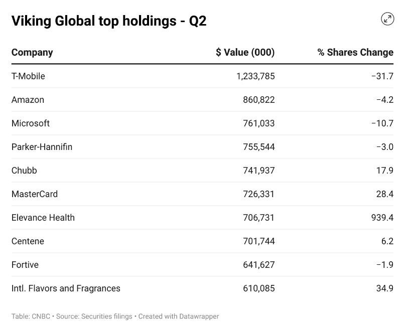 Kromě toho společnost Viking rozšířila své pozice ve společnostech Chubb a Centene, které na konci června patřily mezi jejích deset největších podílů.