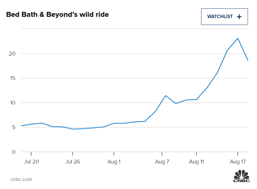 Tento měsíc tato značka vystřelila nahoru, protože se do ní vložili maloobchodní obchodníci, což vedlo k neobvykle vysokým objemům a nadměrným pohybům. Bed Bath & Beyond v srpnu vzrostla o více než 250 %, ale v pátek klesla o 42 % poté, co vyšlo najevo, že investor Ryan Cohen tento týden dokončil prodej celého svého podílu ve společnosti.