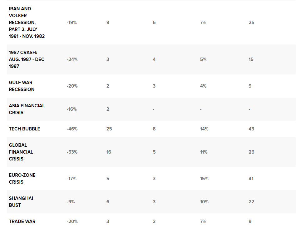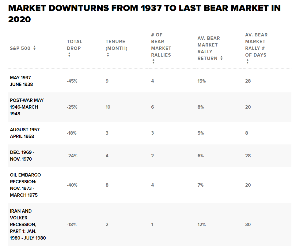 Nejdelší medvědí trh trval 25 měsíců během dotcomové recese na počátku století a měl osm rally. Nejkratší poklesy byly během recese zažehnuté íránskou revolucí a bojem bývalého předsedy Fedu Paula Volckera proti inflaci na počátku 80. let a Covid v roce 2020, přičemž oba trvaly pouhé dva měsíce.