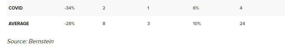 Kromě průměrného poklesu o 28 % zjistila, že poklesy trvaly v průměru sedm měsíců a medvědí trh se v průměru třikrát zvedl.