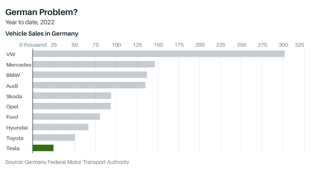 Tesla v Německu do srpna prodala téměř 25 000 vozů. To je meziroční nárůst o zhruba 37 %, který však stačí pouze na to, aby Tesla získala tržní podíl ve výši zhruba 1,5 %. (Srpnový podíl společnosti Tesla na trhu bateriových elektrických vozidel činil v Německu přibližně 16,5 %).