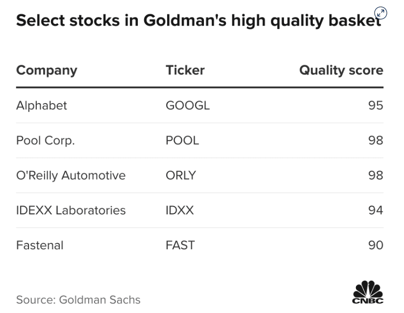 Goldman Sachs sestavil koš 50 kvalitních akcií s nejvyšším „kvalitativním“ skóre v každém sektoru. Akcie s vysokým skóre kvality se vyznačují kombinací silných rozvah, historicky stabilního růstu tržeb a zisků, nadprůměrné návratnosti vlastního kapitálu a nízkého historického rizika čerpání, uvedl Goldman Sachs.