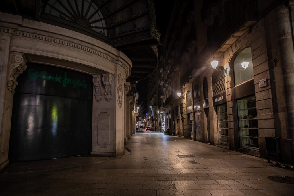 Maloobchodní prodejny s vypnutým hlavním osvětlením v Barceloně v souladu s pravidly, podle kterých musí podniky v noci zhasínat světla. – Zdroj: Getty Images