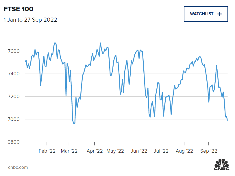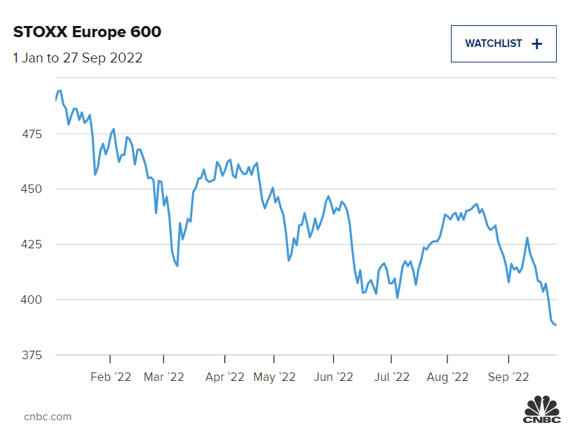 Euro Stoxx 600 by měl do konce letošního roku klesnout o téměř 8 %, uvedla investiční banka v pondělní zprávě pro klienty.V úterý index klesl o 0,1 % a obchodoval se kolem hodnoty 388. Za poslední měsíc se rovněž propadl přibližně o 8 %.Pokud by klesl na 360, jak Goldman Sachs očekává, byl by nižší o více než 25 % oproti svému nedávnému vrcholu ze začátku letošního roku.Goldman Sachs předpovídá, že se index panevropských velkých společností v příštích šesti měsících vrátí na současnou úroveň, ale za rok by měl vzrůst na 410, což představuje 9% nárůst včetně dividend.Banka na Wall Street rovněž snížila cílovou cenu pro FTSE 100 na 6600 a Euro Stoxx 50 na 3100 pro příští tři měsíce. To představuje pokles o 6 %, resp. 7,4 % oproti současným úrovním.„Byli jsme medvědí vůči akciím a tvrdili jsme, že tento medvědí trh ještě neskončil,“ uvedli analytici.Chcete využít této příležitosti?Co je příčinou snížení hodnocení?Goldman Sachs uvedl, že jeho prognóza recese v Evropě v roce 2023 se „prohloubila“. Nyní očekává, že ekonomika eurozóny v příštím roce poklesne o 0,4 %, což je horší výsledek, než se původně předpokládalo. HDP ve Spojeném království podle banky v příštím roce pravděpodobně také poklesne o 0,3 %.Ve výzkumné zprávě se uvádí, že zvýšení úrokových sazeb Evropskou centrální bankou a Bank of England spolu s rostoucími náklady na energie v důsledku sníženého přísunu plynu z Ruska povede v nadcházejících měsících k „mírné“ recesi.Přestože ceny zemního plynu klesly ze svého maxima z konce srpna, zůstávají vyšší nejméně desetinásobně oproti svému dlouhodobému průměru.Goldman Sachs také uvedl, že zdravé finance domácností, silný trh práce a dotované ceny energií sice „zmírní dopad“ rostoucích úrokových sazeb, ale k jejich úplnému zmírnění to stačit nebude.Zdroj: BloombergJak zaujmout poziciGoldman Sachs je obzvláště medvědí, pokud jde o prognózy zisků evropských společností.Z průzkumu společnosti FactSet vyplývá, že analytici očekávají pro rok 2023 v Evropě růst zisku na akcii o 3 %. Naproti tomu Goldman Sachs očekává v příštím roce pokles zisku na akcii o 10 %.Také řada dalších účastníků trhu se staví k očekávání zisků negativně.„Vzhledem ke zpomalení růstu a dalšímu růstu nákladů očekáváme, že marže budou zasaženy,“ uvedli analytici.Obr z Wall Street předpověděl, že nejvíce budou postiženi maloobchodníci, protože jejich zisky jsou závislé na příjmech spotřebitelů. Dodal, že zranitelná jsou také odvětví stavebnictví a chemického průmyslu kvůli jejich expozici vůči vysokým cenám energií. Banka má ve všech třech sektorech podváženou pozici.Zdroj: Getty ImagesU „některých defenzivních“ sektorů, včetně zdravotnictví a telekomunikací, stejně jako u bank a energetiky, je převážena .„Dáváme přednost přístupu „barbell“ s některými kvalitními oblastmi, například s naším košem High & Stable Margins …, kde EPS pravděpodobně zůstane odolný, některými defenzivními a některými hodnotovými oblastmi, které jsou podle našeho názoru obzvláště podhodnocené,“ napsali analytici.Goldman Sachs uvedla, že od února zaznamenala každý týden prodej evropských akcií manažery fondů.Upozornila však, že ačkoli prodeje zatím nejsou velké, srovnání s předchozími poklesy ukazuje, že jich bude ještě více.