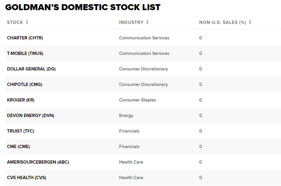Těm, kteří hledají dlouhý obchod, dává Goldman Sachs klientům k dispozici americké akcie, které mají všechny prodeje na domácím trhu, takže nepodléhají stejnému měnovému riziku jako nadnárodní společnosti. Akcie těchto společností by mohly zaznamenat zvýšenou poptávku investorů, kteří se chtějí ukrýt v domácích hráčích nepodléhajících žádnému měnovému riziku.