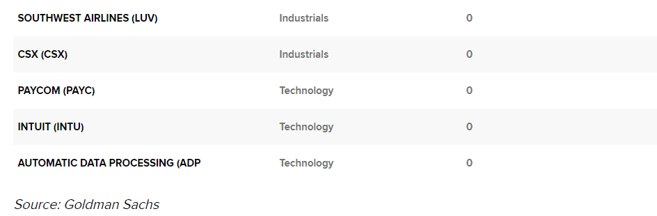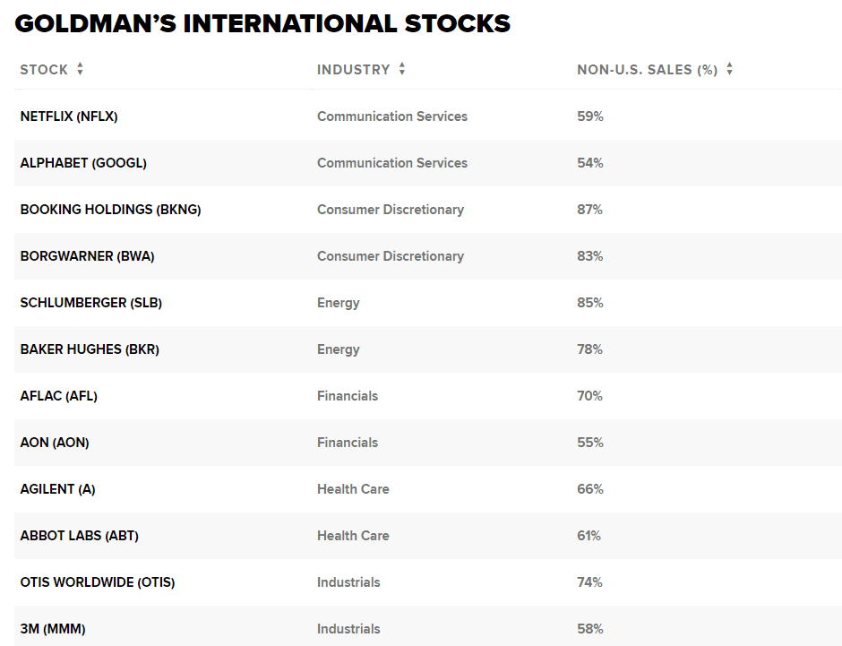 Na druhou stranu existují určitá jména, kterým by se investoři měli v tomto prostředí vyhnout, nebo v případě hbitých obchodníků vsadit proti nim. Goldman Sachs má v koši společnosti, které získávají velkou většinu svých tržeb ze zemí mimo USA, což je činí zranitelnými vůči nejnovějšímu prudkému růstu zelené měny.