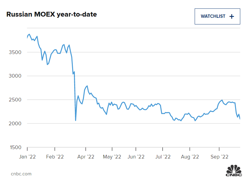Trhy v Moskvě všeobecně klesají od chvíle, kdy prezident Vladimir Putin minulý týden vyhlásil vojenskou mobilizaci, čímž nastavil ruskou ekonomiku na válečné podmínky a pravděpodobně prodloužil konflikt na Ukrajině.