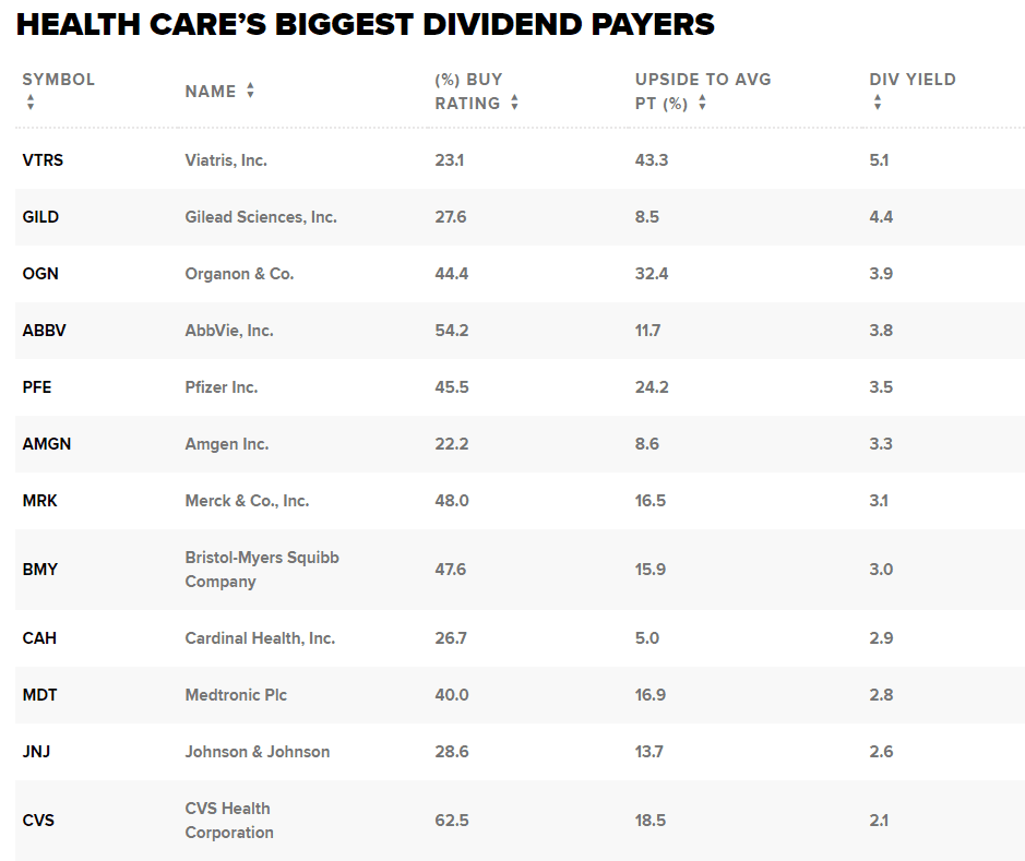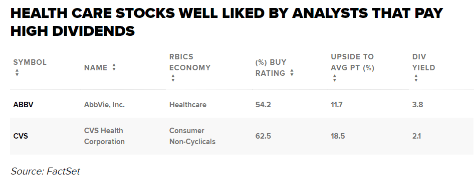 Nyní, v prostředí rostoucích úrokových sazeb, mohou být některé části tohoto sektoru díky svým dividendám připraveny na ještě lepší výnosy.„Když přemýšlím o zdravotnictví, myslím na to, že jde o stabilní společnosti, které prodávají věci, které lidé potřebují, oproti věcem, které lidé chtějí,“ řekl Art Hogan, hlavní tržní stratég společnosti B. Riley Wealth Management. Ve zdravotnictví „máte stále společnosti, které vyhazují dobré výnosy, takže získáváte stabilitu a dobré dividendové výnosy“.Biotechnologický a farmaceutický průmysl mají průměrný dividendový výnos 2,6 %, čímž se řadí hned za sektory spotřebního zboží, veřejných služeb a energetiky.Tři společnosti s nejvyššími dividendovými výnosy jsou výrazně nad průměrem. Výrobce nástrojů pro vývoj léků Viatris má výnos 5,3 %, společnost Gilead Sciences vyplácí 4,6 % a odštěpená společnost společnosti Merck Organon – která se specializuje na zdraví žen – má výnos 4,25 %.Zdroj: FactSetJejich vysoké výnosy jsou však zčásti způsobeny zápornou výkonností jejich akcií. Všechny tři za posledních 12 měsíců prudce klesly, přičemž společnosti Viatris a Organon se tento týden dostaly na nová minima.„Akcie mají vyšší hodnotu než jejich výplata dividend. Poptávka po léčivých přípravcích zůstane silná a osvědčila se jako dobrá hra v případě zpomalení/recese,“ uvedla Gina Sanchezová, generální ředitelka společnosti Chantico Global. Dodala však, že „s pokračujícím růstem výnosů budou čelit silnější konkurenci“.CNBC Pro provedla výběr akcií zdravotnických společností se solidním dividendovým výnosem, které se těší velké oblibě analytiků a zároveň překonávají výkonnost trhu. Do hodnocení se dostaly pouze dvě akcie: výrobce léků AbbVie a gigant v oblasti lékáren a zdravotnických služeb CVS Health.Chcete využít této příležitosti?Dividendový výnos AbbVie činí 3,9 % a více než polovina analytiků, kteří se touto společností zabývají, ji hodnotí jako nákupní. Art Hogan ze společnosti B. Riley zařadil akcie mezi své nejlepší dividendové tipy a poznamenal, že zatímco nejprodávanější lék společnosti Humira bude v roce 2023 čelit konkurenci biosimilars, cena akcií silně diskontuje odhadovanou míru růstu společnosti ve výši téměř 6 %.AbbVie je americká veřejně obchodovaná biofarmaceutická společnost založená v roce 2013. Vznikla jako spin-off společnosti Abbott Laboratories.Téměř dvě třetiny analytiků hodnotí CVS Health jako nákupní. Dividendový výnos společnosti, pod kterou spadají lékárenské benefity a také divize zdravotního pojištění Aetna, činí 2,1 %. Za poslední tři měsíce akcie CVS vzrostly o 9 %, přičemž 50denní klouzavý průměr akcie je nyní připraven posunout se nad 200denní průměr, což je z technického hlediska potenciálně býčí znamení.CVS Health Corporation je americká zdravotnická společnost , která vlastní CVS Pharmacy , maloobchodní lékárenský řetězec.Přestože CVS tento měsíc podepsala dohodu o akvizici společnosti Signify Health v hodnotě 8 miliard USD a signalizovala, že se snaží nakoupit další aktiva, aby vybudovala své portfolio služeb, společnost zůstává odhodlána vyplácet dividendu. Tento týden představenstvo schválilo čtvrtletní dividendu ve výši 55 centů na akcii.