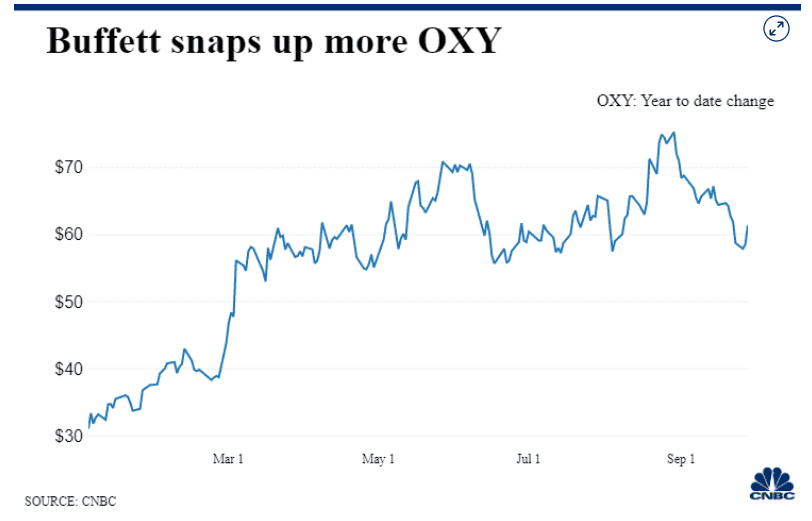 Podíl Berkshire v Occidentalu nyní dosáhl 20,8 % poté, co v posledních několika měsících sázku postupně zvyšovala. V srpnu získala Berkshire souhlas regulačních orgánů s nákupem až 50 %, což podnítilo spekulace, že by nakonec mohla koupit celý Occidental se sídlem v Houstonu.