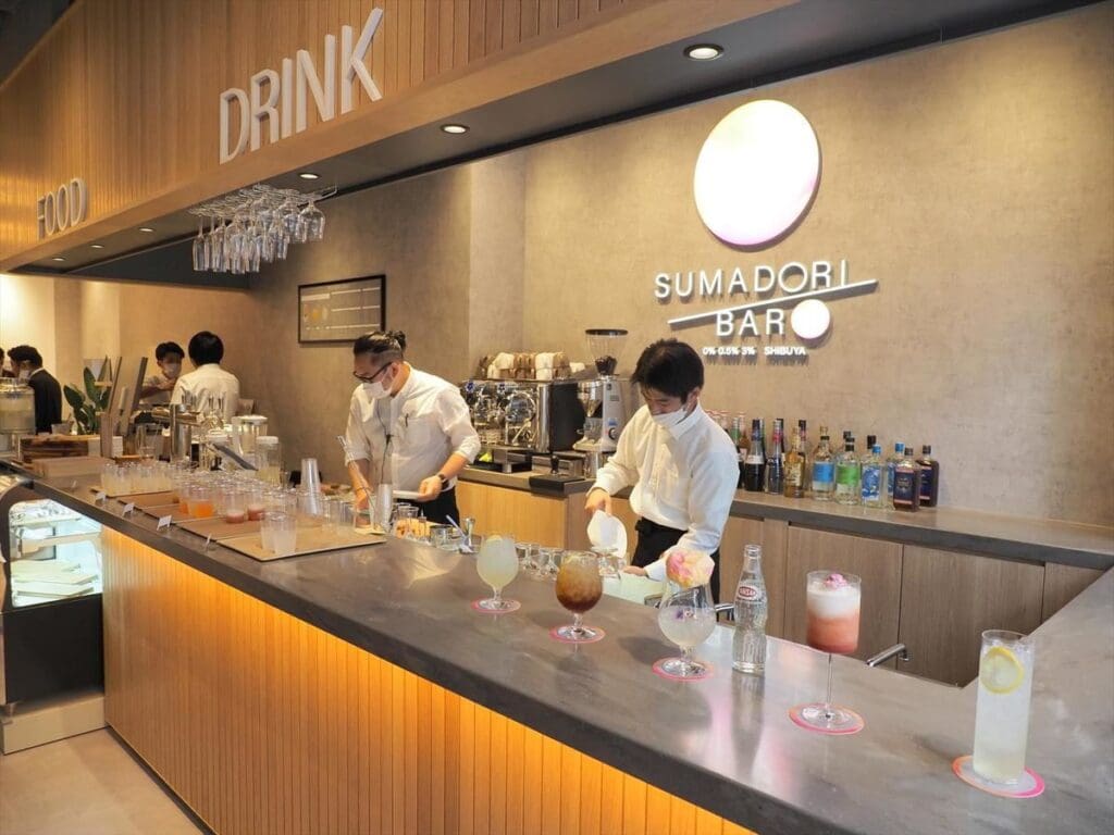V Šibuji nově otevřený bar Sumadori – což je japonská slovní hříčka pro „chytré pití“ – nabízí propracované sladké koktejly, které mohou být připraveny bez alkoholu nebo s obsahem až 3 %. Nabízí prostředí, kde si každý může vychutnat drink společně, uvedl Mizuho Kajiura, výkonný ředitel podniku vedeného společností Asahi.