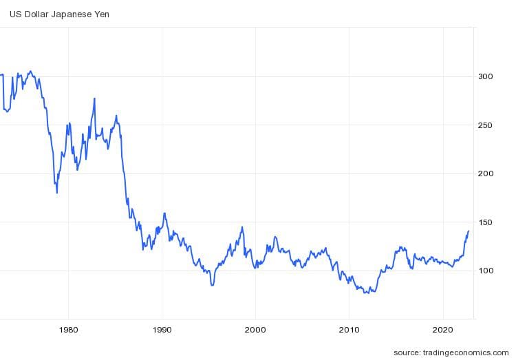 Kurzy USD/JPY za posledních 50 let – Zdroj: Tradingeconomics.com