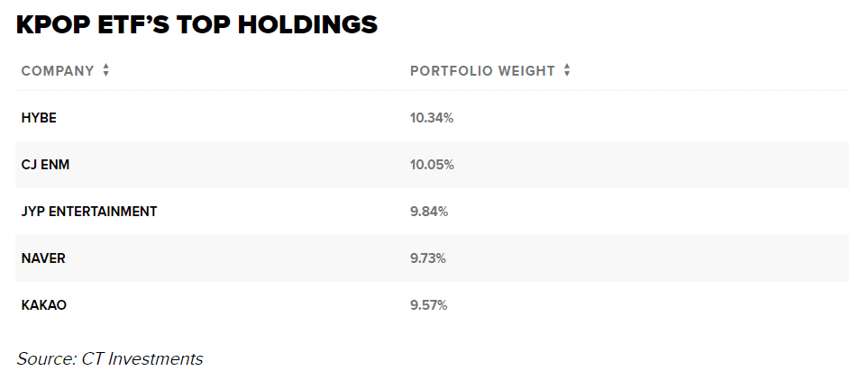 Fond KPOP and Korean Entertainment ETF, který se začal obchodovat ve čtvrtek pod tickerem „KPOP„, je určen pro akcie, které se obchodují v Jižní Koreji a mohly by těžit z pokračujícího mezinárodního rozšíření zábavního průmyslu v této zemi. K-popová hudba se již dostala do Bílého domu v podobě květnové návštěvy chlapecké skupiny BTS.
