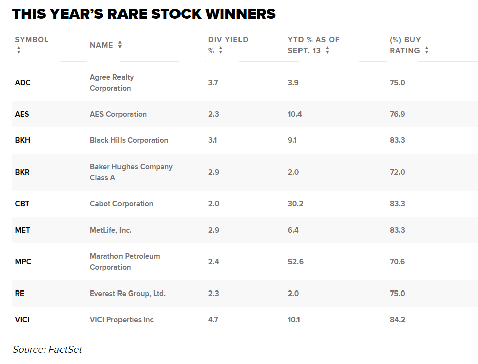 K nalezení těchto takzvaných přístavů v bouři použila společnost CNBC Pro data společnosti FactSet, aby prověřila akcie v indexu S&P 1500 Composite, které mají kladnou roční bilanci, vyplácejí dividendu 2 % nebo více a jsou oblíbené u analytiků, přičemž nejméně 70 % z nich je doporučuje koupit.