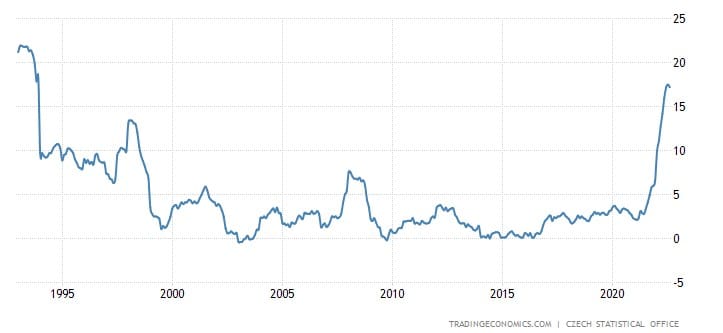 Podobná inflace jako v Česku je například v Bulharsku (17,9 procenta), Bělorusku (17,9 procenta), Makedonii (16,8 procenta) nebo Bosně a Hercegovině (16,7 procenta). Ze zemí G20 má nejvyšší inflaci stále Turecko s mírou přes 80 procent, následuje Argentina se 71 procenty a Rusko, kde je oficiální inflace 14,3 procenta.