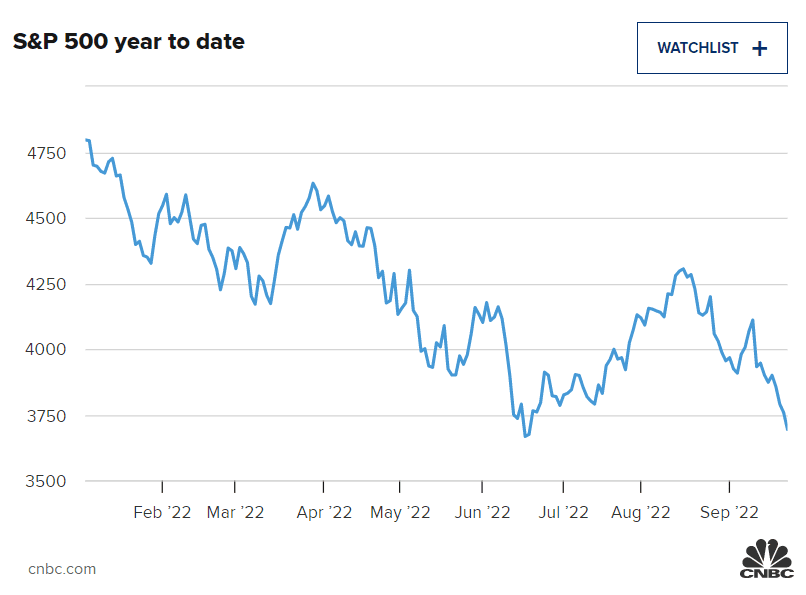 Indexy S&P 500, Dow a Nasdaq v tomto týdnu výrazně klesly. Index S&P klesl o 4,6 % a týden zakončil na úrovni 3 693 bodů. Byl také na cestě k 6,6% měsíční ztrátě v září, které je pro akcie tradičně nejhorším měsícem v roce.