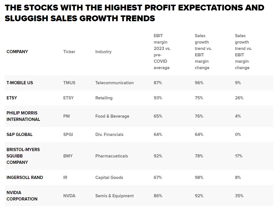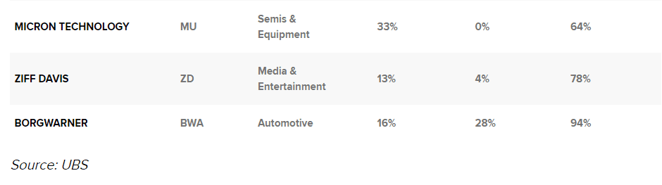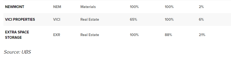 UBS také uvedla, že investoři by se měli vyhýbat jménům s vysokým očekáváním EBIT marže a zpomalujícím se růstem tržeb, a to z toho důvodu, že tyto marže by mohly být v budoucnu ohroženy.