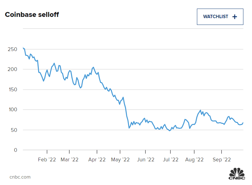 Firma Wells Fargo ve čtvrtek zahájila pokrytí kryptoměnové společnosti s ratingem underweight a cílovou cenou 57 USD, což znamená, že akcie klesnou o více než 15 % oproti středečnímu závěru. V roce letošním roce se akcie Coinbase propadly o více než 73 %.