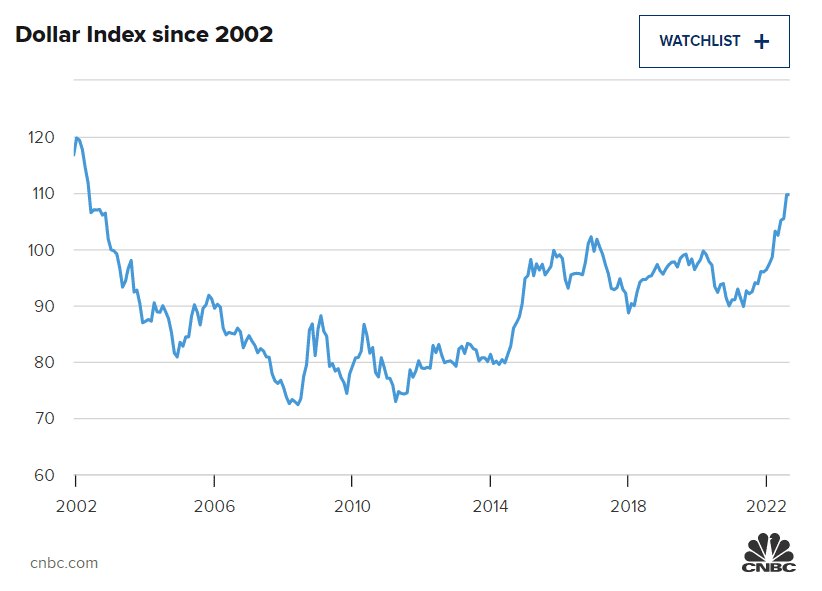 Tyto měny vůči dolaru klesají, protože ostatní centrální banky se snaží držet krok s tempem zvyšování sazeb Fedu. Silnější dolar může mít na akcie nepříznivý vliv, protože kvůli němu mají zahraniční příjmy nadnárodních společností nižší hodnotu. Dvojnásobně působí vyšší úrokové sazby, které snižují ocenění růstových a technologických společností, protože rostou náklady na peníze.