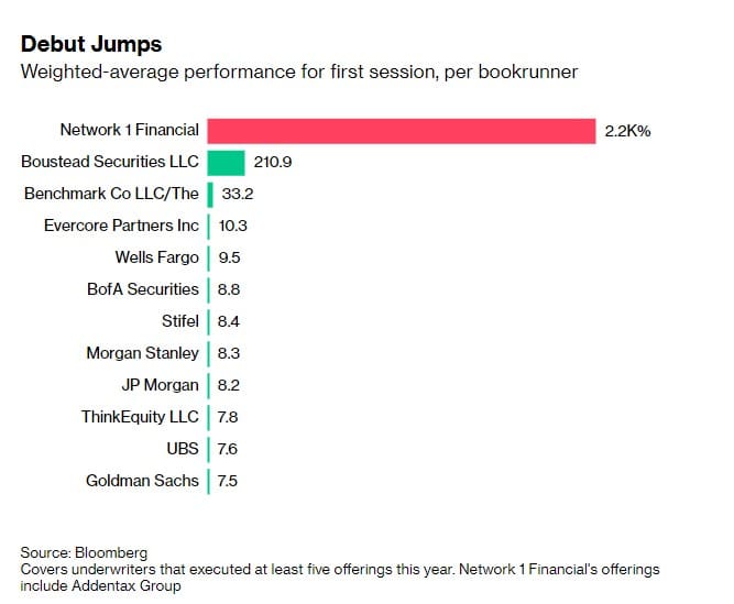 Společnost Network 1 Financial Securities Inc., která sídlí v Red Banku ve státě New Jersey, letos upsala šest amerických IPO firem s mikrokapitálem, které v první den obchodování vzrostly v průměru o 2 190 %. To je podle údajů agentury Bloomberg více než 250krát více než u nabídek upsaných společnostmi Goldman Sachs Group Inc, JPMorgan Chase & Co a Morgan Stanley.