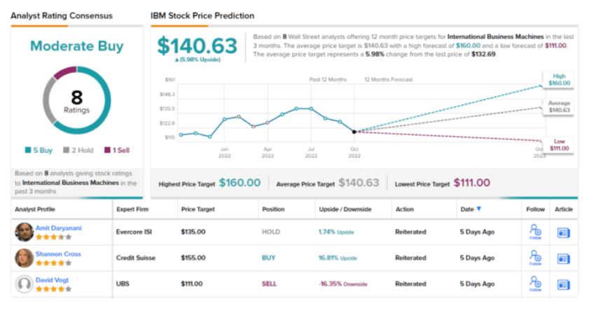 Celkově má společnost IBM od konsenzu analytiků mírné hodnocení „Buy“ na základě 8 recenzí v rozdělení na 5 „Buys“, 2 „Holds“ a 1 „Sell“. Akcie IBM se prodávají za 132,69 USD a jejich průměrná cílová cena 140,63 USD znamená roční zisk ~6 %.