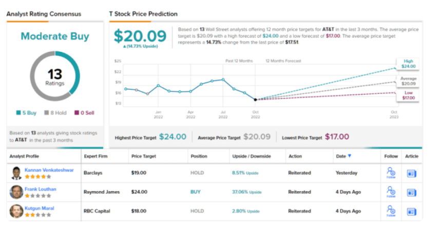 Celkově tento blue chip získává od konsenzu ulice mírné hodnocení „Buy“ na základě 13 hodnocení analytiků, z toho 5 „Buys“ a 8 „Hold“. Obchodní cena AT&T je 17,51 USD a průměrná cílová hodnota 20,09 USD, což naznačuje ~15% nárůst do konce příštího roku.