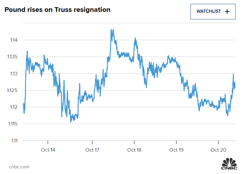 Libra vzrostla vůči dolaru o 0,5 %. a hodinu po oznámení se obchodovala za 1,1273 USD, čímž se krátce dotkla maxima seance. Zůstává na úrovni, na které byla 22. září před rozpočtem Trussové, který rozhýbal trh. Výnosy 30letých, 10letých a 5letých gilů (britských státních dluhopisů) se po Trussově krátkém projevu snížily o přibližně 5 bazických bodů.