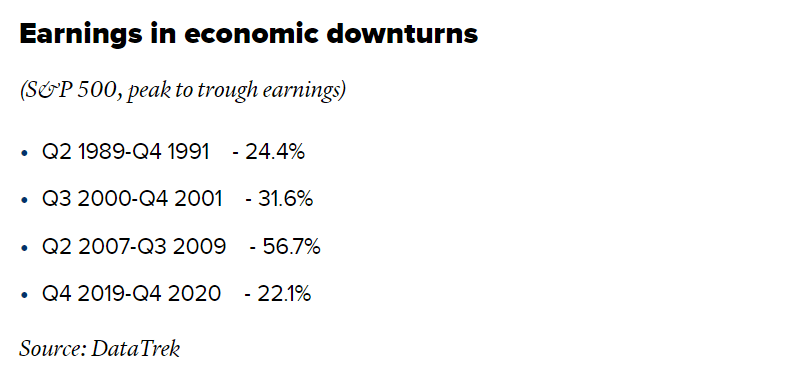 Obchodníci dobře vědí, že recese má vždy za následek pokles zisků. O kolik se zisky sníží, závisí na rozsahu recese, ale určitě je normální pokles o více než 20 %, jak poznamenal DataTrek: