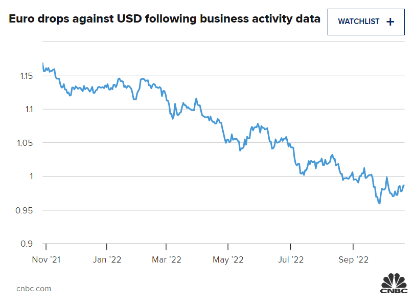 Euro bylo pod tlakem v souvislosti s jestřábím postojem Federálního rezervního systému a energetickou krizí, které eurozóna čelí po ruské invazi na Ukrajinu.