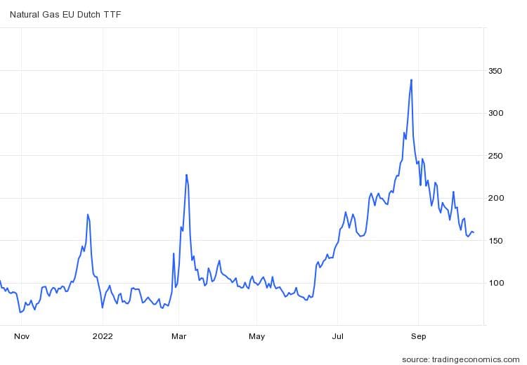Futures na evropský plyn se snížily poté, co norský provozovatel sítě uvedl, že po možné bombové hrozbě na poli Ormen Lange a ve zpracovatelském zařízení Nyhamna nedošlo ve čtvrtek k žádnému narušení přepravy plynu. Těžba je v normálu a pracovníci se vracejí na místo, uvedla společnost Shell Plc.Ceny dříve kvůli obavám z projektů vyskočily až o 9,2 %, což zdůraznilo rozsah nervozity na trhu. Následuje po podobných výkyvech na začátku tohoto týdne, kdy se zvýšila kontrola kolem energetické infrastruktury poté, co nedávné výbuchy v zastaveném systému plynovodů Nord Stream vyřadily tento systém z provozu na dobu neurčitou. Na úseku klíčového ropovodu, kterým proudí ruská ropa do Německa, došlo nedávno v Polsku k úniku, ale úřady později uvedly, že šlo pravděpodobně o nehodu.Obchodníci jsou v napětí. Ruský prezident Vladimir Putin prohlásil, že po explozích na plynovodu Nord Stream je ohrožena jakákoli energetická infrastruktura na světě. Podle něj profitovaly USA, Ukrajina a Polsko. USA a jejich spojenci tato obvinění odmítají a naznačují, že za výbuchy pod vodou mohla stát Moskva.Ty zvyšují obavy o dodávky právě v době, kdy eskalace ruské války na Ukrajině ohrožuje poslední plynovodní trasu pro kremelské dodávky plynu do západní Evropy. Prozatím jsou tyto toky stabilní, i když na snížené úrovni posledních několika měsíců. Varování Moskvy před sankcemi vůči ukrajinskému provozovateli plynárenství a příval raketových útoků z tohoto týdne však znervózňují evropské politiky.Evropský plyn – Zdroj: TradingeconomicsNizozemský plyn na front-month, evropský plyn, se obchodoval o 0,4 % výše na úrovni 160,87 eur za megawatthodinu. Britský ekvivalentní kontrakt klesl o 0,3 % a rovněž se pohyboval mezi zisky a ztrátami.Norská zařízení jsou klíčová pro dodávky plynu do Evropy. Kontinent již nyní čelí zimě s minimem plynu z Ruska a jakékoli další narušení by mohlo znamenat rozsáhlý nedostatek a prudký růst cen. Zásoby jsou plnější než obvykle a dovoz zkapalněného zemního plynu zajišťuje dostupnost, ale období chladného počasí nebo delší výpadek by mohly situaci znejistit.„Současná nabídka plus zásoby by měly stačit na pokrytí poptávky v letošní zimě“, i kdyby se tranzit ruského plynu přes Ukrajinu zastavil, uvedli analytici Morgan Stanley ve své zprávě a dodali, že pravděpodobnost zastavení se zvýšila. Přesto Evropa, která bude v příštím roce stahovat více LNG, omezí celosvětové dodávky, což znamená vyšší rizika pro kontinent v příštím roce, uvedla.Chcete využít této příležitosti?Francie poprvé dodává plyn přímo do Německa, to na oplátku posílá elektřinuFrancie dnes poprvé začala posílat zemní plyn přímo do Německa, aby mu pomohla mírnit dopady krize na energetickém trhu. Oznámil to francouzský provozovatel plynovodní sítě GRTgaz. Německo na oplátku posílá do Francie elektřinu, které má tato země aktuálně nedostatek, zejména kvůli odstávce zhruba poloviny jaderných reaktorů.