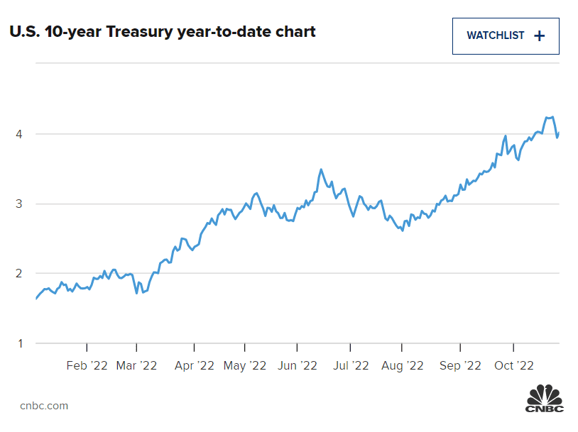 S tím, jak investoři nabyli většího přesvědčení, že by Fed mohl zpomalit, akcie rostly a výnosy dluhopisů klesaly. Výnosy klesají, když ceny dluhopisů rostou, a ostře sledovaný desetiletý výnos byl v pátek odpoledne na úrovni 4,01 % z nedávného maxima 4,32 % z předchozího pátku.