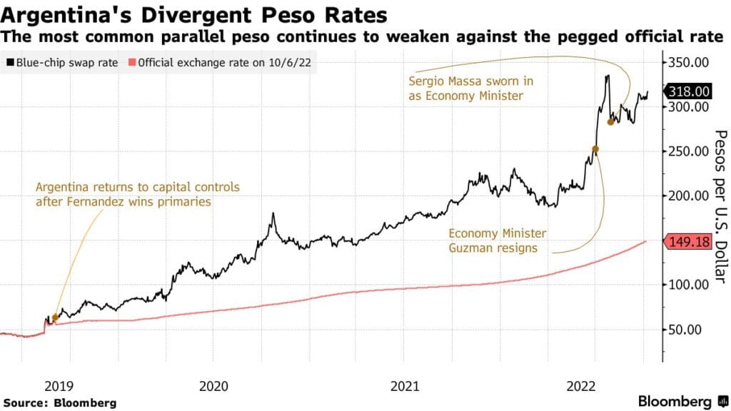 Argentina a její oficiální směnný kurz je značně omezený. Jednotlivci si mohou legálně vyměnit pesos v bance za oficiální kurz maximálně za 200 dolarů měsíčně a musí zaplatit dvě daně, které k ceně přidávají zhruba 75 %.