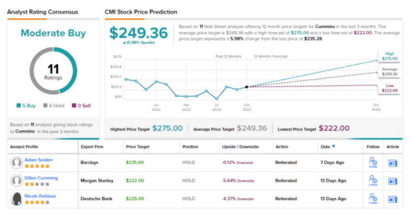 Co si myslí zbytek ulice? Při pohledu na konsenzuální rozdělení jsou názory ostatních analytiků rozptýlenější. Akcie má 11 nedávných hodnocení analytiků, která se rozpadají na 5 kupujících a 6 držících, což představuje konsenzuální názor mírného nákupu. S průměrnou cílovou cenou 249,36 USD a obchodní cenou 235,28 USD má společnost Cummins jednoletý potenciální růst o přibližně 6 %.