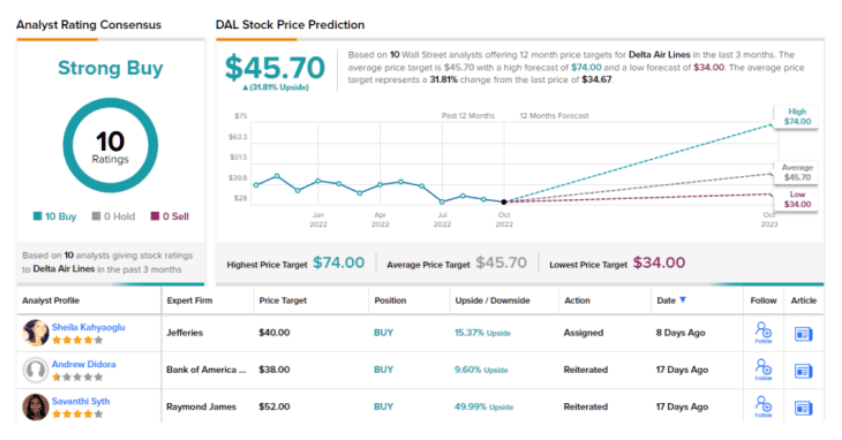 Podívejme se tedy blíže na akcie leteckých společností, které Cramer doporučuje. Otevřeli jsme databázi TipRanks, abychom získali jejich nejnovější statistiky, a přidáme k nim nedávné komentáře analytiků z ulice. Obě akcie mají hodnocení Buy a obě vykazují dvouciferný růstový potenciál. Zde jsou podrobnosti.