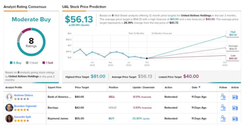 Celkově akcie společnosti United získaly 8 nedávných hodnocení analytiků, přičemž tato hodnocení zahrnují 6 hodnocení Buys, 1 hodnocení Hold a 1 hodnocení Sell, což představuje konsenzuální hodnocení Moderate Buy. Akcie se prodávají za 43,72 USD a jejich průměrná cílová cena 56,13 USD naznačuje potenciální růst o ~28 % v nadcházejících měsících.