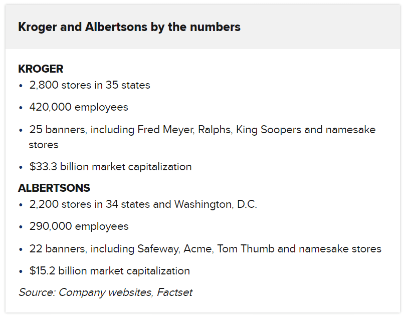 Kroger je druhým největším prodejcem potravin podle podílu na trhu ve Spojených státech, hned za Walmartem a Albertsons je čtvrtý po Costco. Spojením by se společnosti Kroger a Albertsons přiblížily Walmartu.
