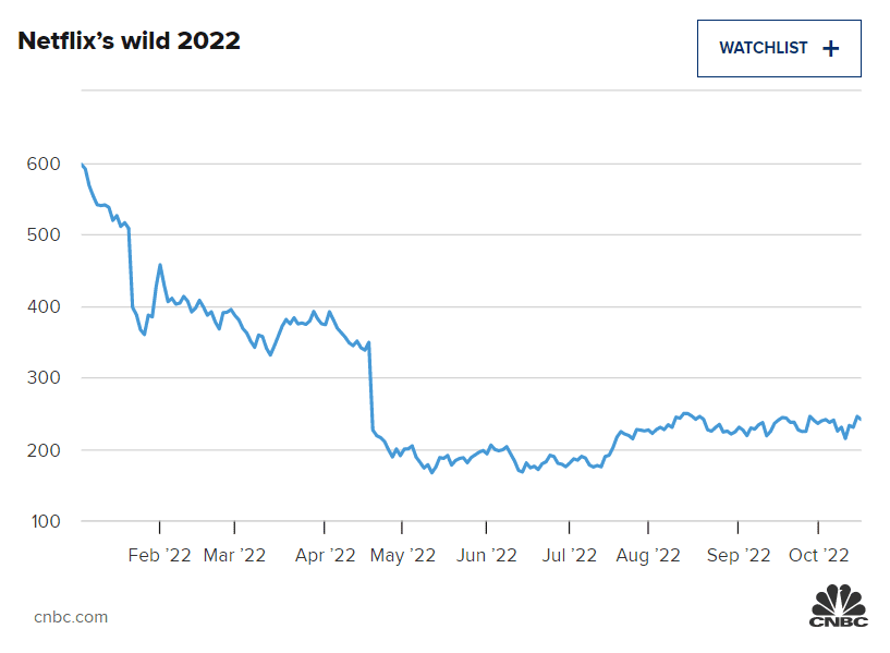 Netflix se v roce 2022 dostal pod tlak poté, co na začátku tohoto roku vykázal první ztrátu předplatitelů za více než deset let. Akcie se letos propadly o 60 % a jsou zhruba 66 % pod svým 52týdenním maximem. Pro jistotu je třeba dodat, že akcie Netflixu se v posledních týdnech mírně odrazily ode dna a jen v říjnu posílily o více než 2,3 %.