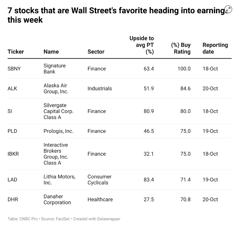 Zatímco se investoři pohybují v divokém měsíci na trzích, CNBC Pro použila data FactSet k vyhledání akcií, které si analytici Wall Street nejvíce oblíbili. Tyto názvy mají nákupní hodnocení od více než 70 % analytiků, kteří se danými akciemi zabývají, a jejich průměrná cílová cena vzrostla nejméně o 20 %. Všechny tyto akcie budou reportovat v týdnu od 17. do 21. října.