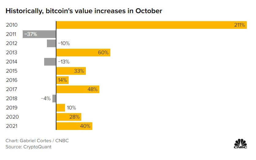 V sedmi z posledních deseti let zaznamenal bitcoin kladný měsíc. Naposledy si připsal 40% zisk v roce 2021, poté co v roce 2020 zaznamenal 28% a v roce 2019 10% nárůst. Vyplývá to ze spotových závěrečných cen na burze sledovaných poskytovatelem dat CryptoQuant. Čtyři z posledních šesti let zakončil ether říjnový obchodní měsíc výše, uvádí Kaiko.