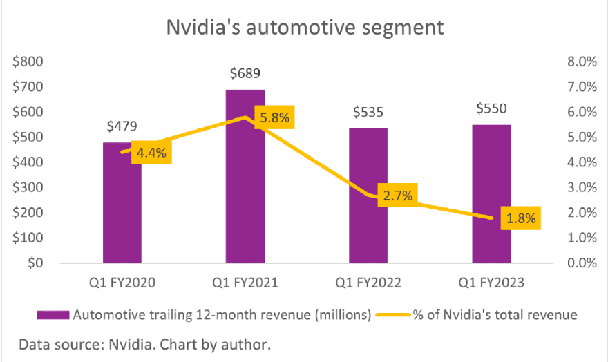Nejmenší segment společnosti Nvidia – automobilový průmysl a robotika – je však pravděpodobně nejzajímavější. Je to jen malá část celkového podnikání společnosti, která za posledních 12 měsíců tvořila jen 1,8 % jejích celkových příjmů, ale to má reálný potenciál se změnit.