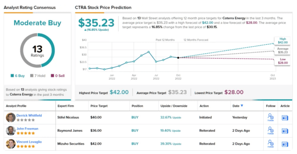Analytik Derrick Whitfield ze společnosti Stifel má na společnost Coterra pozitivní názor a uvádí jasné argumenty pro nákup této společnosti: „Jsme konstruktivní, pokud jde o management a portfolio projektů společnosti v oblasti zdrojů, které byly vytvořeny organicky. CTRA nabízí investorům přesvědčivou kombinaci kvality (aktiv a managementu) a hodnoty. Vedení navíc zůstává odhodláno dosáhnout +50% návratnosti pro akcionáře (bez zpětného odkupu akcií) a v posledních dvou čtvrtletích vrátilo 69 %, resp. 80 % FCF prostřednictvím peněžních dividend a zpětného odkupu akcií.“
