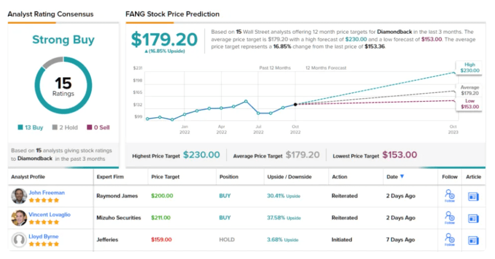 Celkově se k akciím FANG v poslední době vyjádřilo neméně než 15 analytiků, přičemž 13 analytiků jim udělilo konsenzuální hodnocení „Buy“ a 2 „Hold“. Obchodní cena akcie 153,36 USD a průměrná cílová cena 179,20 USD znamenají pro příštích 12 měsíců 16% růst.